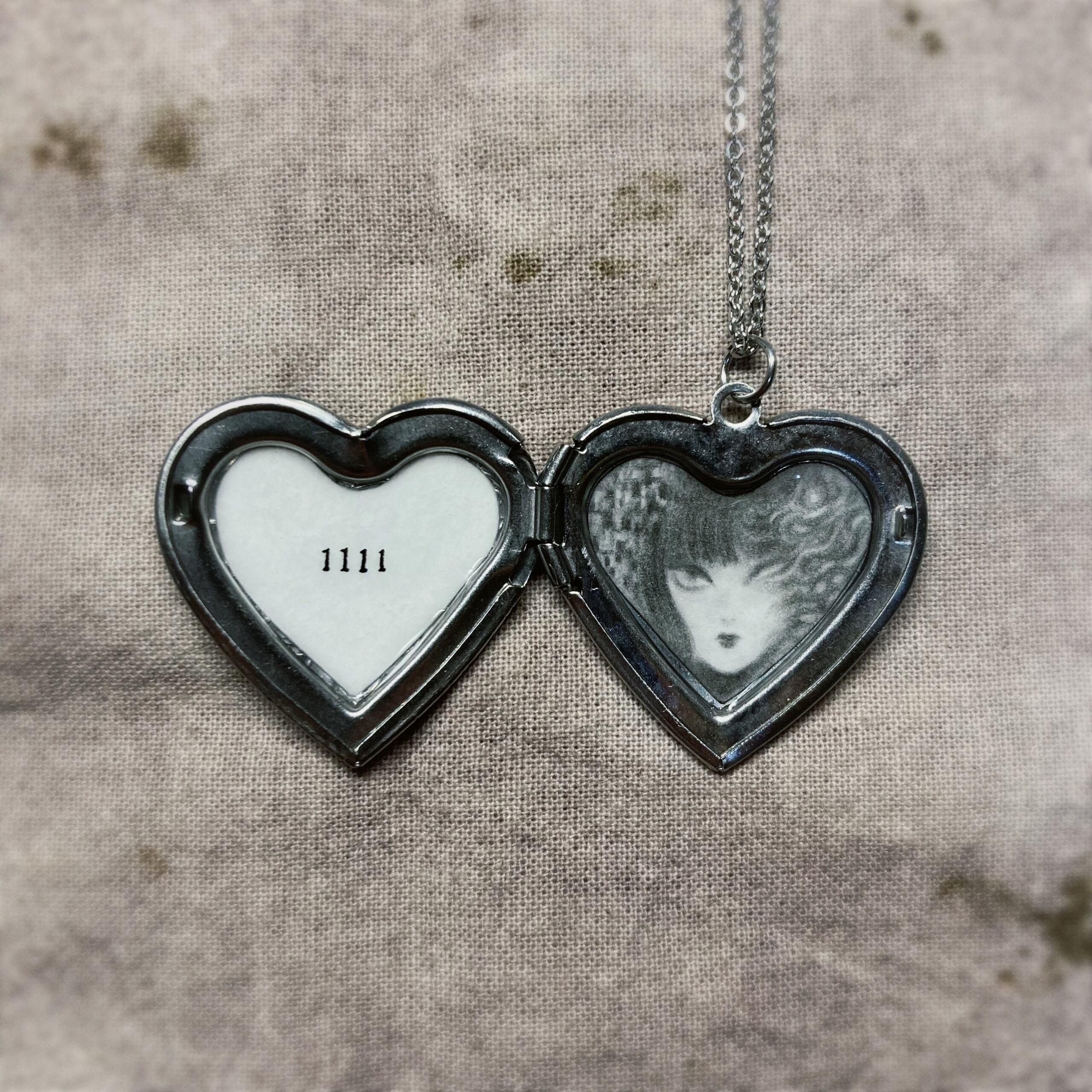 液体金属にノイズがかかったような宇宙人の肖像と、宇宙人からのメッセージ「 1111 」を込めたお守りロケットペンダントです。