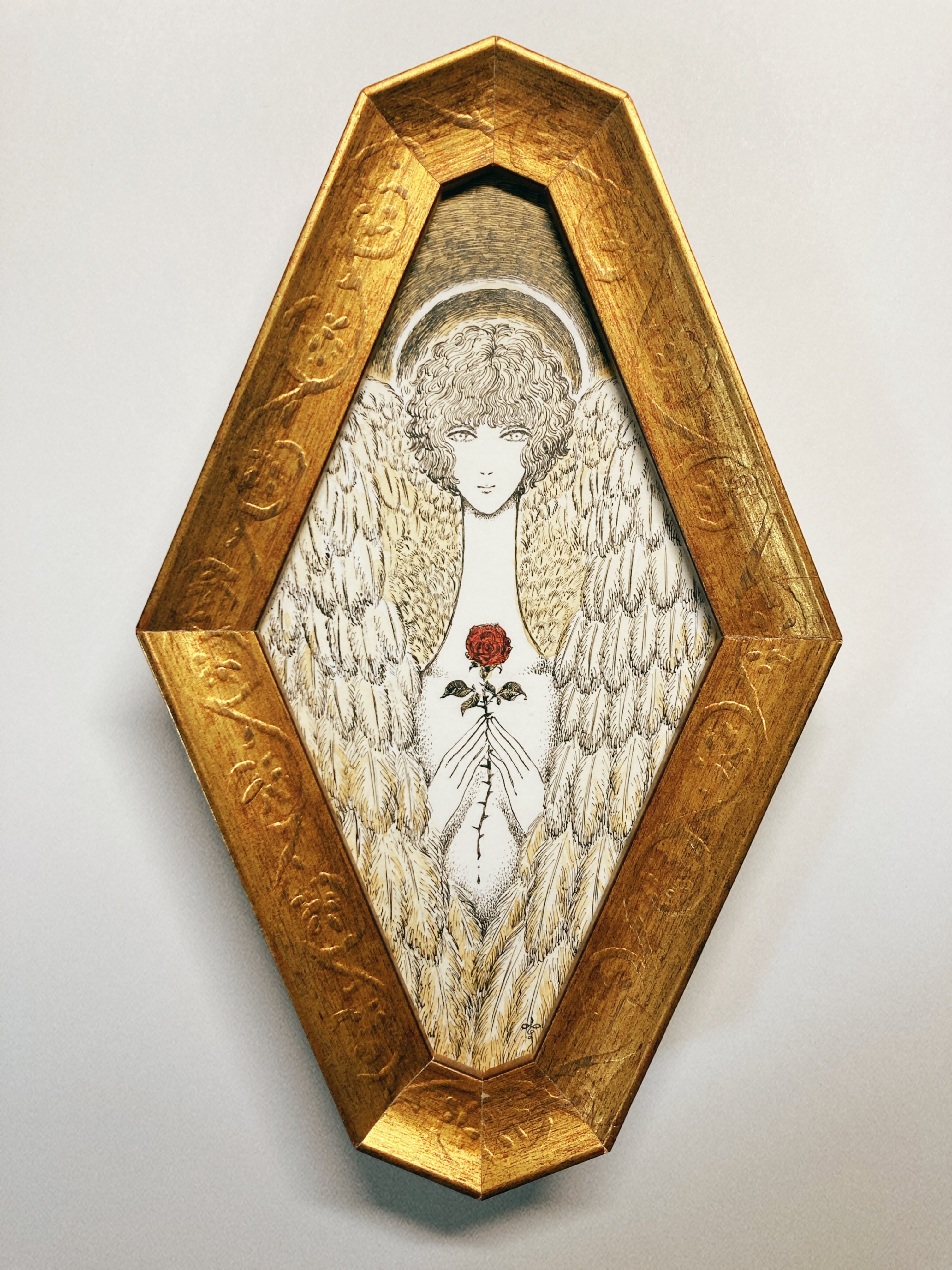 制作が思うようにいかず描き直しになった時に、心を落ち着けようとこの絵に取りかかったらこのような言葉が浮かびました。それから何か些細なこと(インクが掠れたとか、ズレたとか歪んだとか)に意識が向く度「愛しています」と繰り返し聴こえてくるような気がしました。血を流す一輪の薔薇を大きなハートの翼で包むように、人間の自分が自分を許せない時も、ただただ愛し続ける天使の自分がいるのです。