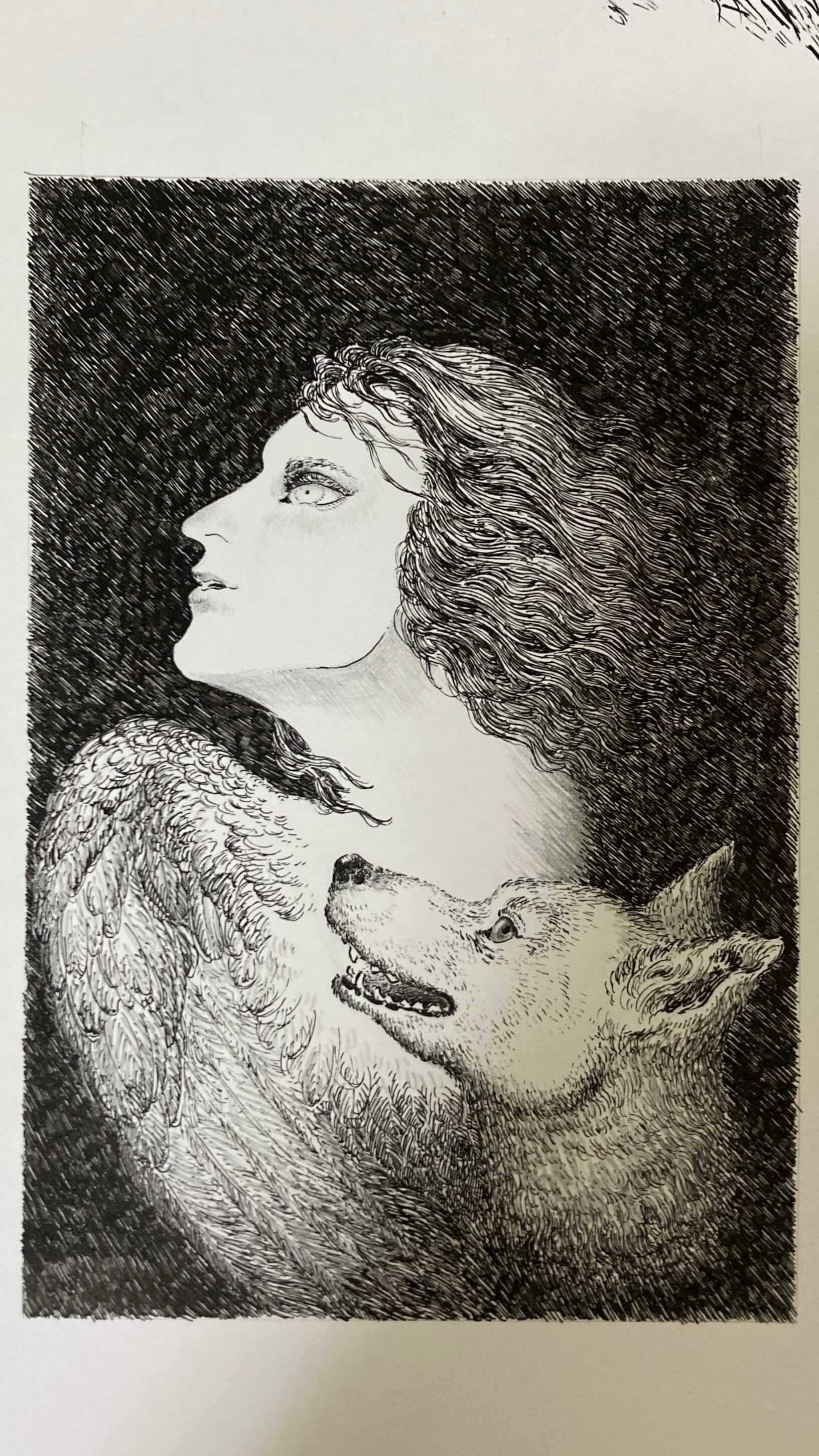 過去を振り返らず何も恐れず、盲目的なまでの無謀さで好奇心のままに次元を超えてゆけというメッセージを込めて描きました。翼は自由、犬は共にゆく仲間(見えるものも見えないものも)をイメージしています。