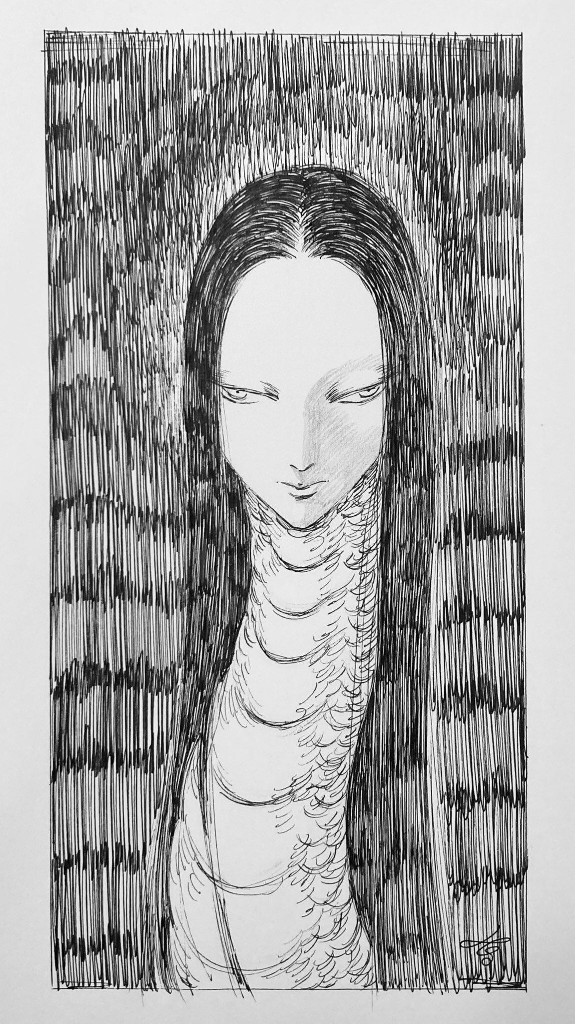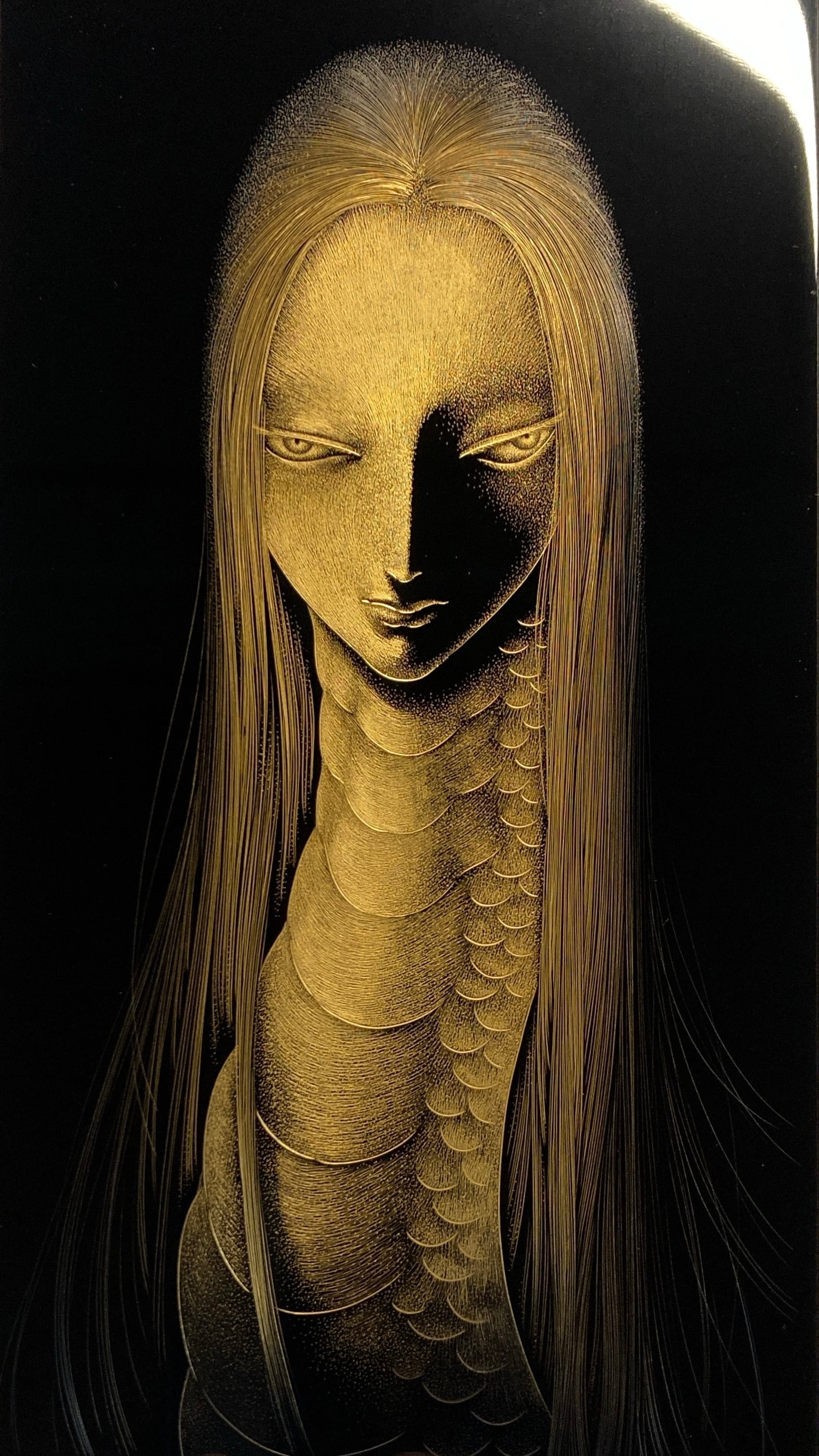 龍神高龗神(たかおかみのかみ)からインスピレーションを得て、人頭蛇身の姿からギリシャ神話の怪物エキドナのようでもあり、果たして私が彫っているのは神か怪物か作品と対話しながら制作する中で